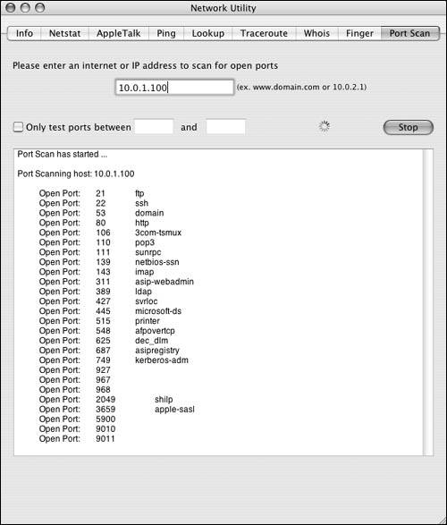 Type in the IP address of your server, and click the Port Scan button. The list of open ports returned tells you whether your firewall is configured to your liking (Figure 10.18).