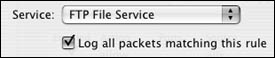 | 7. | Choose FTP File Service from the Service pop-up menu, and decide whether you want to log information related to this rule (Figures 10.26 and 10.27).