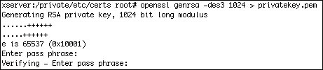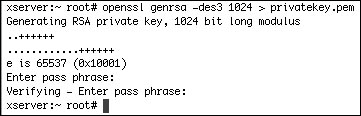 openssl genrsa des3 1024 > privatekey.pem This tells the openssl command to generate an RSA-style key with a Triple-DES cipher at 1024 bits and to save the key as privatekey.pem (Figure 10.41).