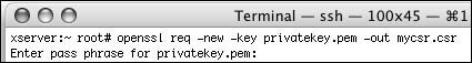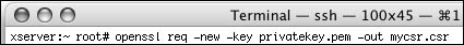 | Tip Certificate Signing Requests You've now created a private key, which only you have; do not give this key file to anyone! Now you must create a Certificate Signing Request (CSR) with that key. CSRs are made on behalf of a server or service and presented to a CA. This process is done via the command-line interface on Mac OS X Server. Therefore, you must ensure that you make no typos, because the command-line interface (CLI) isn't forgiving. To create a Certificate Signing Request: 1. | In the Terminal, type the following command on one line (Figure 10.42):