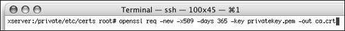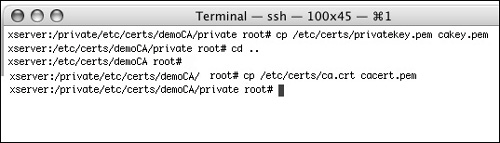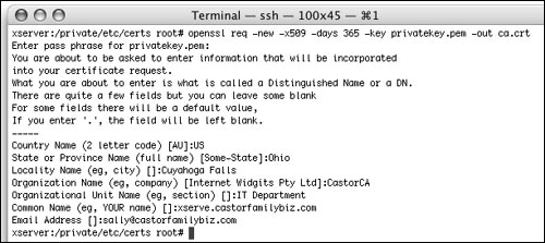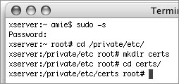 | Tip Acting as a Certificate Authority Another possibility is that you don't need to pay for a CA to tell you that you're you. You know who you are, and you trust you. More important, your server may be inside a small school or organization where you don't need it for Web-page encryption but for encryption of another service (such as email) or to encrypt the transfer of data when requesting user data via the LDAP protocol. In these cases, you can sign your own certificate, thus avoiding the cost of having some else do it. To act as your own CA: 1. | Open the Terminal application located inside /Applications/Utilities.