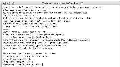 Country Name State Name Locality Name Organization Name Organizational Unit Common Name Email Address  Be sure the common name matches the Web address if you're using this certificate as a Web server certificate, as in Figure 10.42. You also have the option of adding two other entries before writing out the request.
