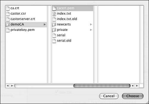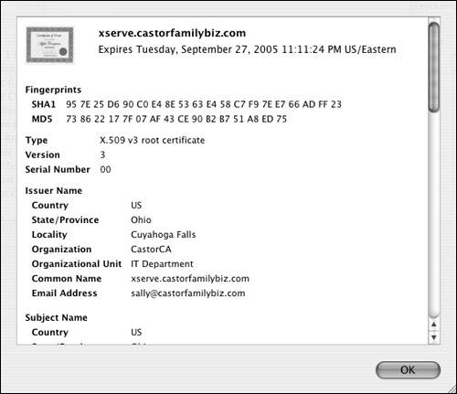 sudo certtool i /etc/certs/ca.crt k=/System/Library/Keychains/ X509Anchors | Implementing certificates Whether you've created your own signed certificate or had a certificate signed by a CA, you can implement certificates in a variety of ways. Mac OS X Server can use certificates with the following services using the Server Admin tool: Open Directory Web sites Mail server By default, if you're using a Mac OS X Server as an Open Directory master, all communications between your client computers and your server with regard to LDAP are passed as clear text. This is a potential security issue. You should set up the server to use Secure Sockets Layer (SSL) encryption and let the client computer know about this as well. If you have a Web site, you should use the certificate to encrypt communications when customers come to your site. If you're running a mail server, you should encrypt all email running through your server. To encrypt Open Directory master communications: 1. | Launch the Server Admin tool located in /Applications/Server, and authenticate as the administrator (Figure 10.61).