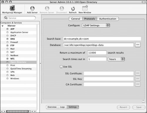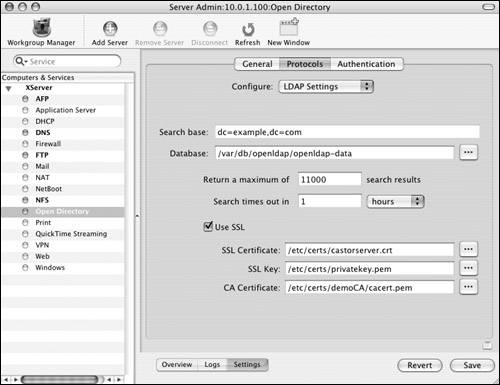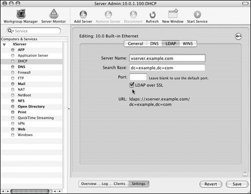 | DHCP LDAP SSL If you set up your server as a DHCP server and you're pushing LDAP information down to your client, you should enable SSL there. To enable SSL for the LDAP DHCP option: 1. | Launch the Server Admin tool located in /Applications/Server, and authenticate as the administrator (Figure 10.70).
