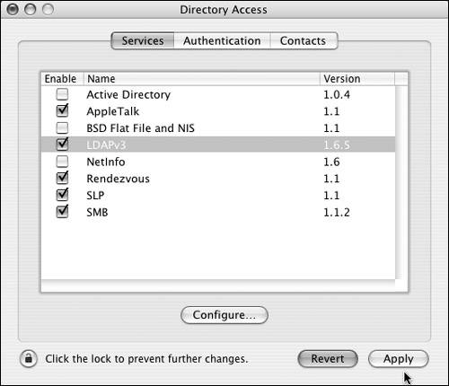 | Setting up Directory Access SSL LDAP You must now tell your server to see itself over SSL. The same procedure outlined in the following task is done on the client machines when you bind to an LDAP server over SSL. To set up Directory Access SSL LDAP: 1. | On your server, open the Directory Access application located in /Applications/Utilities, and authenticate as the administrator using the lock (Figure 10.67).