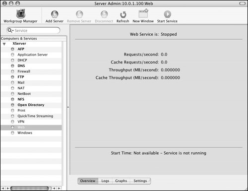 Start the Web service using the Start Service button in the Server Admin Toolbar.
