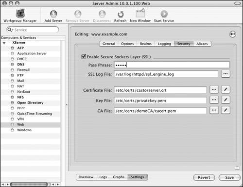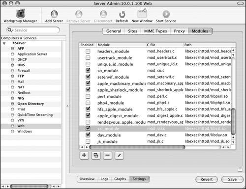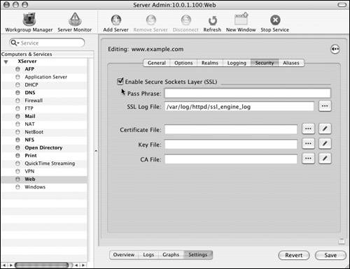 | Web SSL setup When setting up your Web site for SSL, you must consider whether you wish to use the same certificate. This section assumes you're using the same certificate. To enable SSL for the Web server: 1. | Launch the Server Admin tool located in /Applications/Server, and authenticate as the administrator (Figure 10.73).