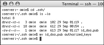 If it doesn't already exist, create a folder called .ssh in the home folder on the server. Move the id_dsa.pub file into the .ssh/ folder, and rename it authorized_keys (Figure 10.86).