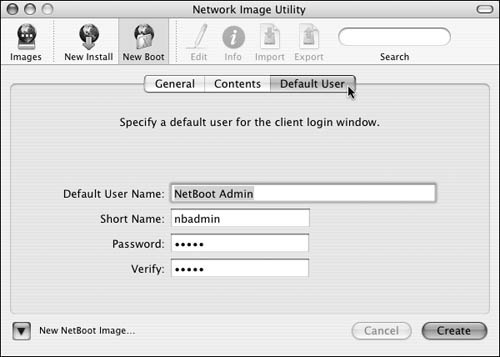 5. | If you're creating a boot image from Mac OS X install CDs, you need to define an administrator account. Click the Default User tab to specify the account settings (Figure 11.5).