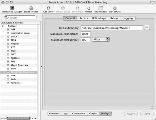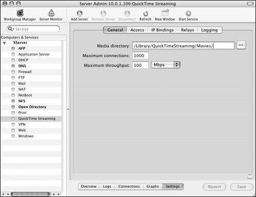 The General tab contains the settings for the directory containing the movies, the maximum number of connections, and the maximum throughput. When you're setting up a QTSS on the Internet, it's critical to limit the number of connections and the throughput during your testing phase to just two or three connections, because the default settings could bring your server to its knees (Figure 12.4).