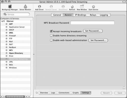 The Access tab lets you administer the QTSS via a Web page by allowing you to set a user name and password for that particular type of administration. The same is true for accepting incoming broadcasts to your server. You can also place streaming folders in every user's Sites folder and set an MP3 broadcast password, restricting access to your MP3 playlists (Figure 12.5).