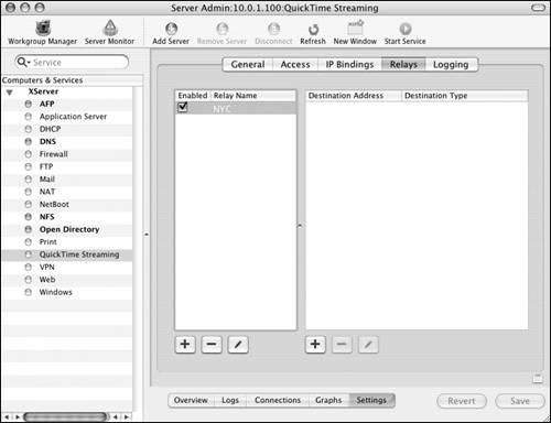 The Relays tab lets you enable relays. Relays allow the QTSS to pass its stream to others QTSS computers, thus reducing the overall load on the originating server. The relay servers must be configured to allow incoming broadcasts (Figure 12.7).