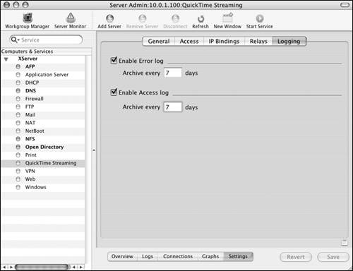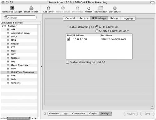 The IP Bindings tab allows streaming to take place over several IP addresses and Ethernet cards if you choose. You can also choose to stream over port 80, allowing users to access your QTSS over port 80, which is generally used for serving up Web sites (Figure 12.6).