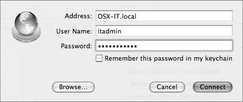 Figure 2.45. Enter your administrator name and password, choose whether you wish to add the password to your keychain, and click Connect.