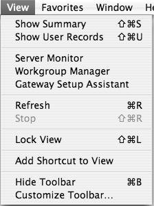 You'll enter your administrator name and password, choose whether you want to add the password to your keychain so you don't have to type it in later, and click Connect. Once you're connected, you'll see your server in the left frame of Server Admin (Figure 2.46). Clicking the disclosure triangle expands or contracts your server, showing or hiding all the services available on that server. Clicking the server address will display some of the advanced server settings. Alternately, clicking any service shows you that service's settings and options in the right frame of the window. Figure 2.46. The main view of Server Admin showing all connected servers on the left. Across the top is the Toolbar, which lets you add, remove, disconnect from, and refresh your server information (Figure 2.47). You can also create a new Server Admin window from the Toolbar, as well as launch the other main server management tool, Workgroup Manager. If you've selected a service, you may also see a Start Service button in the Toolbar . To customize your Toolbar, choose View > Customize Toolbar. Figure 2.47. The Server Admin Toolbar lets you add, remove, disconnect from, and refresh your server information. The Search bar permits you to just show services that have whatever letter is typed into the window. For example, typing "we" would only show Web and WebObjects (Figure 2.48). Figure 2.48. Using the Search function displays only those services with the searched character string.  In addition, you have two view options. You can view all your services and their respective status by choosing View > Show Summary, and you can quickly see your users and groups by choosing View > Show User Records (Figure 2.49). The former option displays the services and their status horizontally (Figure 2.50), and the latter opens a drawer on the left or right of the Server Admin tool that lets you see all the users and groups (Figure 2.51). Figure 2.49. Choosing the View menu displays options such as Show Summary and Show User Records.  Figure 2.50. Choosing View > Show Summary displays services and their status horizontally. Figure 2.51. Choosing View > Show User Records opens a drawer on the left or right of the Server Admin tool that lets you see all the users and groups. You'll probably access the Server Admin tool frequently, so you may benefit from adding your server(s) to a Favorites list that gives you menu and keyboard shortcuts to the server(s). To do this, launch the Server Admin tool, choose Favorites > Add To Favorites, and select your server. You can now access your server when launching Server Admin by heading to the Favorites menu and choosing your server or using the Command key and the number associated with your server in the Favorites menu. Setting Server Admin preferences To customize Server Admin to further suit your needs, choose Preferences from the Server Admin menu. Some of the major options available to you are as follows (Figure 2.52): - You can change the list display from Simple to Advanced, which will provide you with more information about how services are operating.