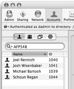 Figure 4.34. When you choose a search pattern, it appears in the Search field.  As you type, the listin this case the keywordis automatically pared down to reveal the user accounts that fit your search criteria (Figure 4.35).