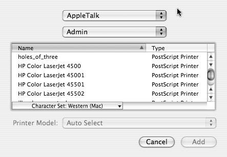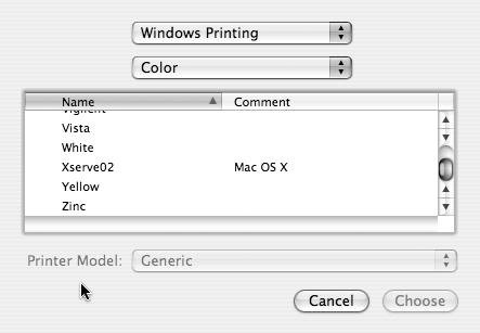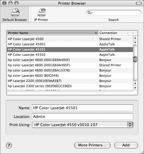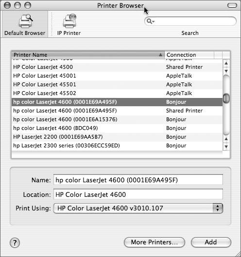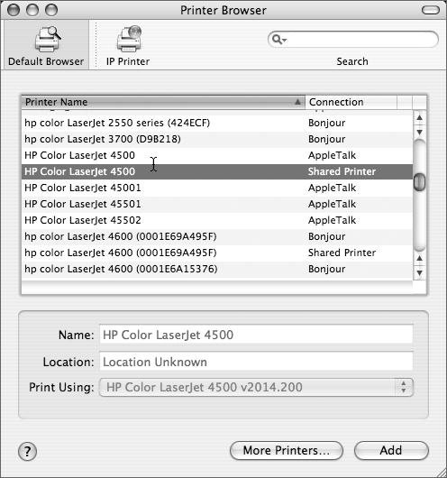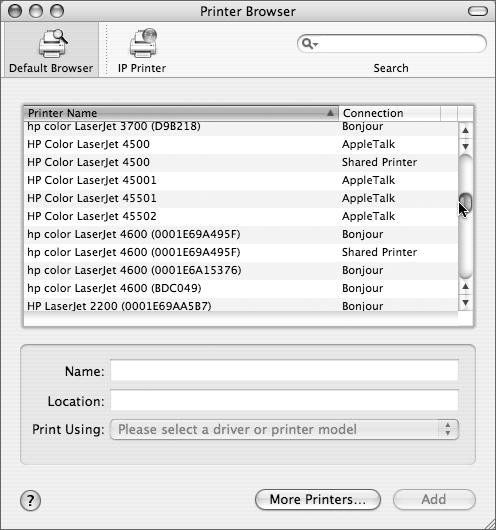 | Mac OS X supports many types of printers, including network and directly connected printers. This section only focuses on using the Printer Setup Utility to add printers shared from a Mac OS X Server. These printers are available to all users on the Mac OS X. There are two parts to the Printer Setup Utility: the Printer List window and the Printer Browser. The Printer List window shows the list of printers added to the local computer, whereas the Printer Browser handles the main browsable printer types, including printers directly attached to your computer. The Printer Browser will also dynamically show AppleTalk, Open Directory (Open Directory can include printers shared via SMB from a Windows computer), and Shared Printers (Shared Printers can include IPP printers shared from another Mac OS X computer). Mac OS X offers three tools for adding printers: The Printer Setup Utility is the easiest and most widely used. In reality, you add printers to your list via the Printer Browser, a separate window of the Printer Setup Utility. The Printer Browser can add printers for the user to print to over the following methods using the Default Browser button: AppleTalk To select an AppleTalk printer in the Printer Browser, find a printer you want to connect to with a Connection type of AppleTalk. Select the printer and click Add (Figure 7.27). A window may appear (depending on the options available for that given printer) while the server communicates with the printer to determine the printer configuration (Figure 7.28). Figure 7.27. Using the Printer Setup Utility's Printer Browser, you can add a printer using the AppleTalk protocol...  Figure 7.28. ...and a window may appear when the printer is auto-configuring.  Bonjour To select a Bonjour printer in the Print Browser, select a printer with a Connection type of Bonjour, and click Add (Figure 7.29). Since Bonjour can't auto-configure the printer for you like AppleTalk can, if the printer has different options, a window will appear, where you can configure those settings (Figure 7.30). Figure 7.29. Using the Printer Setup Utility's Printer Browser, you can add a printer discovered by Bonjour...  Figure 7.30. ...and a window may appear allowing you to choose printer options.  Shared Printer To select a shared IPP printer in the Print Browser, select a printer with a Connection type of Shared Printer and click Add. With a shared printer, a user cannot set the name, location, or the printer type, nor can they change them in the Printer Setup Utility once they've added the printer, because those settings are all determined by the computer sharing the printer, a feature that administrators may want to take advantage of (Figure 7.31). Figure 7.31. Using the Printer Setup Utility's Printer Browser, you can add a shared printer.  Open Directory To select an Open Directory printer in the Print Browser, select a printer with a connection type of Open Directory. If the location and printer type are set for you, verify that they're set correctly, and click Add (Figure 7.32). A window appears offering "Installable Options," if there are any (Figure 7.33). Set the options correctly, and click Continue. In the Print Browser window, printers being shared via SMB from Active Directory servers will also show up as "Open Directory," even though they technically aren't. If these printers require authentication, click More Printers at the bottom of the Print Browser window to add them. Figure 7.32. Using the Printer Setup Utility's Printer Browser, you can add a printer discovered by Open Directory...  Figure 7.33. ...and a window may appear allowing you to choose printer options.  If the printer is not being advertised by methods that cause it to show up in the Default Browser window, you can also create local printers via other methods. Using any of these three methods requires you to enter the information on the printer manually: Internet Printing Protocol IPP To add printers via IPP, enter the printer's IP address or DNS name, and the queue, if needed. Enter a name for the printer in the Name field; this is the name you'll see when you select the printer in the print dialog/sheet. If you don't enter a name, then the IP address or DNS name will be used. Optionally, you can also enter a location for the printer. Select the specific printer type to be used, and then click Add (Figure 7.34). Figure 7.34. Using the Printer Setup Utility's Printer Browser, you can add an LPD (IP) printer.  Line Printer Daemon LPD Use this option for LPR printers. The options are the same as IPP. HP Jet Direct Socket Use this option to connect to HP printers via the HP JetDirect protocol. Other than the specific type of printer, the options are the same as IPP and LPD. Tip If your printer doesn't appear in the browser list, or you have a printer that needs manual/nonstandard settings, click More Printers to display a menu of various options by printer connection type (Figure 7.35). Figure 7.35. This pop-up menu shows various connection options when creating a printer.  AppleTalk If your AppleTalk network is configured with multiple zones, select the appropriate zone from the pop-up menu. In either case, AppleTalk printers automatically populate in the list based on zone (Figure 7.36). Figure 7.36. Selecting an AppleTalk printer in another zone.  Bluetooth If you have a Bluetoothcapable Mac, any Bluetooth printers will show up on this list. Select the printer from the list, verify that the model is correct or pick the correct driver, and click Add (Figure 7.37). Figure 7.37. You can add Bluetooth printers to the printer list.  Windows Printing If your Windows network is configured with multiple workgroups, select the appropriate workgroup from the pop-up menu. Initially you'll be presented with computers running Windows (SMB) printer sharing. Select a computer from the list and click Choose (Figure 7.38). Then select the printer from the list, and click Add (Figure 7.39). Figure 7.38. V