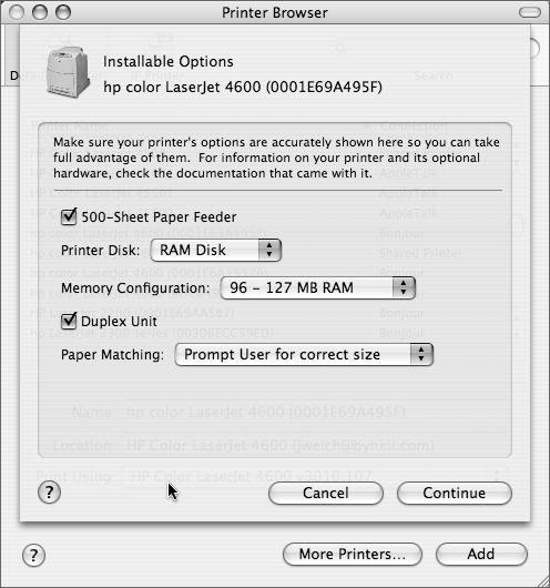 When you click Add, another window offering "Installable Options" may appear. You can pick any additional options the printer may have, such as extra memory or a duplex unit. Set the correct options for your printer, and click Continue. This will add the printer to the Printer List window in the Printer Setup Utility.