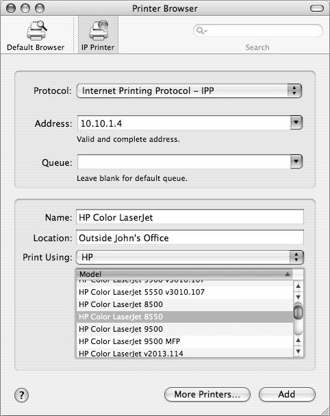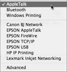 USB With USB printing, plugging in the USB printer is usually enough. You may need to install the printer drivers and printer description files if a CD is included with your printer. Consult the directions and CD that came with your USB printer in that case. Other Options Depending on the printers you use, you may have other options available, such as Epson AppleTalk or Canon BJ. These are specific to the printer(s) you use, and you should consult the specific documentation for information on using those connection types (Figure 7.41). Figure 7.41. Some printers require special drivers, which are installed and viewed separately.  The Advanced option Sometimes you have a printer you need to add, but it requires a slightly different setup than you would normally see via the Printer Setup Utility. For those printers, the Printer Setup Utility has the Advanced option. This option is normally hidden, as you shouldn't use it casually. To access it, hold down the Option key while clicking More Printers in the Printer Browser window. In the list of available options that appears, you'll see a new entry: Advanced. In the Advanced options, you can manually set up any kind of printer Mac OS X can see. Of all the possibilities, one of the most common is connecting to a printer that uses IPP but via a HTTP URL. This is common with HP Laser printers that support IPP. To create a printer 1. | On Mac OS X, launch the Printer Setup Utility.