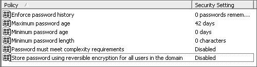 pwpolicy -n /NetInfo/DefaultLocalNode -getglobalpolicy | which returns this result: usingHistory=0 canModifyPasswordforSelf=1 usingExpirationDate=0 usingHardExpirationDate=0 requiresAlpha=0 requiresNumeric=0 expirationDateGMT=12/31/69 hardExpireDateGMT=12/31/69 maxMinutesUntilChangePassword=0 maxMinutesUntilDisabled=0 maxMinutesOfNonUse=0 maxFailedLoginAttempts=0 minChars=8 maxChars=0 passwordCannotBeName=0 requiresMixedCase=0 newPasswordRequired=0 Since there is no GUI for changing these parameters, you would use the command line to change them for local-only accounts. Therefore, it is important to understand that both Mac OS X and Mac OS X Server have very similar security policies. In contrast, Windows 2003 and Windows XP have the following password policies:  The one policy that is not clearly defined in the preceding image is "Password must meet complexity requirements." When this option is enabled, the password must meet the following criteria: It must not contain all or part of the user's account name. It must be at least six characters in length. It must contain characters from three of the following four categories: English uppercase characters (A through Z) English lowercase characters (a through z) Base 10 digits (0 through 9) Non-alphanumeric characters (!, $, #, %)