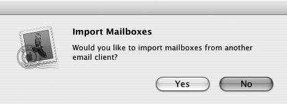 Figure 2.1. When you first launch Mail, it asks if you want to import mailboxes from another e-mail client, which is great if you've been using a different client and want to take the leap to Mail. Click Yes to import mailboxes; click No to skip this step and move on.  | 2. | Click No.