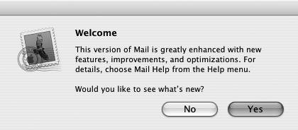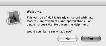 Figure 2.11. Again, Mail asks if you'd like to see what's new in this version. Click Yes to take a tour; click No to skip this step and move on.  | 11. | You can click Yes another time for a pleasant tour, but for now click No. You're ready to use Mail to send and receive e-mail with your .Mac e-mail address.