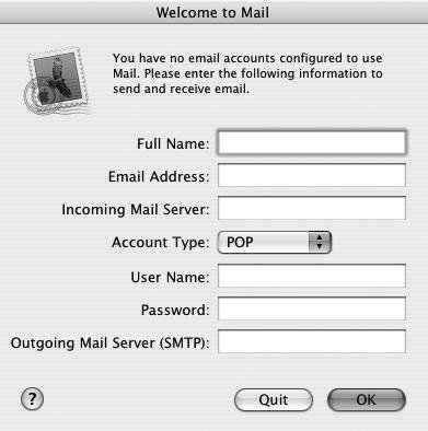 Figure 2.8. Creating a new Mail account in Mac OS X v10.3 is fairly simple, and Mail gives you a blank slate from which to start.  | 2. | In the Full Name field, type your name.