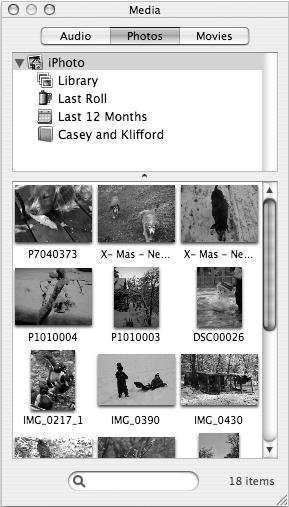 Figure 5.24. The Media Browser displays all of your iLife-related music, movies, and pictures.  | 4. | If it's not already selected, click the Photos tab in the Media Browser window. Your iPhoto library is displayed (Figure 5.25).