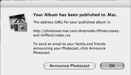 The photos and generated RSS file are uploaded to your .Mac account, and a dialog appears, telling you that your album has been published (Figure 6.17).
