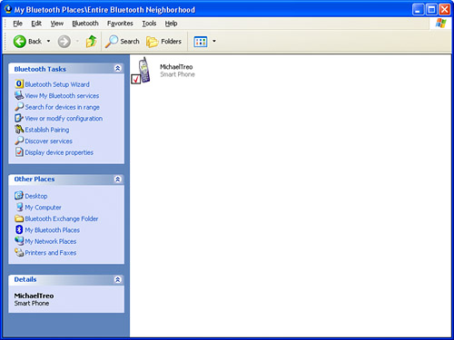 Figure 11.12. Use the My Bluetooth Places window on your desktop computer to access your Treo via Bluetooth.  Tip If your Treo doesn't find the headset, first check to make sure the Bluetooth radio on the Treo is turned on. If Bluetooth is already turned on, double-check that you have turned on the headset and set it correctly so that it can be discovered. On my Motorola headset, it took a few tries before I realized how long the multifunction button had to be held down to enter "discovery" mode. | 2. | Pay close attention to the icon representing your Treo in the My Bluetooth Places window. If it has a small red checkmark in the lower-left corner of the icon (as shown in Figure 11.12), you have already paired the device to your desktop computer and can transfer files to your Treo without having to do anything special. If there's no checkmark, your Treo isn't paired with the desktop computer, and you have to enter passkeys for both machines.