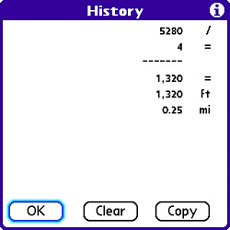 | The numeric notations on the Pref menu actually correspond to floating-point (Float), fixed-point (Fixed(x)), scientific (Sci(x)), and engineering notation (Eng(x)). The last three notations have an x in their names because these modes expect you to enter a number indicating the number of decimal places to display for each notation. The Pref menu also enables you to switch between degrees (Degrees), radians (Radians), and gradians (Grads). Radians express angles in terms of the math constant pi, and gradians are a European form of degrees; there are 400 grads in a circle, as compared to 360 degrees. The Pref menu is the same in all the advanced modes except Logic mode, in which case the menu changes so that you can change the base and width of numbers. More specifically, you can choose between binary (Bin), octal (Oct), signed decimal (SDec), unsigned decimal (UDec), and hexadecimal bases (Hex). The storage width of a number can be set to 8 Bit, 16 Bit, or 32 Bit. The last detail to cover for the Calc application is the History feature, which displays a list of recent calculations you've performed. To access the history, press the Menu button and select Show History on the Edit menu. A history of your recent calculations is displayed, as shown in Figure 2.25. In this example, I divided 5280 by 4, and then converted the result from feet to miles. Figure 2.25. The History feature of the Calc application displays a list of recent calculations.