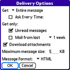 | 5. | The Download Attachments setting causes attachments to be downloaded automatically. However, the total message size (including attachments) must still fall below the maximum message size for the attachment to download automatically. Otherwise, you have to explicitly get the entire message. The maximum message size defaults to 5KB, but you can raise it up to nearly 5MB (5,000KB, to be exact). This size limits only the amount of email data that's retrieved automatically; you can always perform a "get" on a specific message to download it in its entirety, even if it's larger than the maximum size.