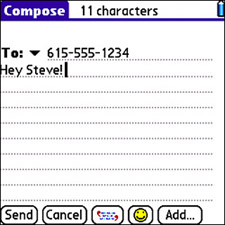 | If a mobile phone or handheld is capable of SMS messaging, you send the owner a message by simply addressing the message to his or her mobile phone number. Follow these steps to compose and send an SMS message using your Treo device: 1. | Press the Messaging button (just to the lower right of the five-way navigator) to launch the Messaging application. You can also navigate to the Messages application on the main application screen and launch it if you've changed the Messaging application button.