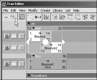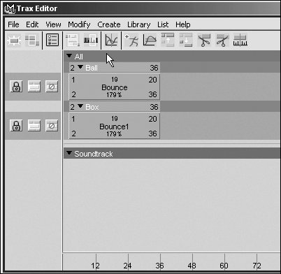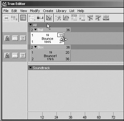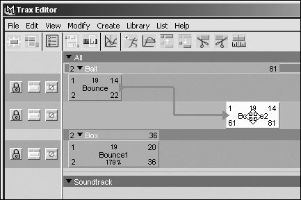 Figure 12.81. The Trax Editor lets you have multiple tracks for each character or subcharacter. By using multiple tracks, you can have more than one clip playing at the same time for the same character. This trims the clip so the Box goes up but doesn't come down.