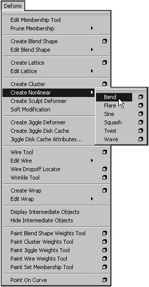 Figure 13.6. All of the nonlinear deformers can be created from the Deform > Create Nonlinear menu.  A bend deformer is added to the selected surface.