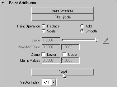 Figure 13.39. You can use the Flood feature of the Paint Attributes tool to quickly smooth out deformer weights, creating a more natural effect.  This smooths out the jiggle weights across the surface of the object (Figure 13.40). (See "About Deformer Weights," later in this chapter.)