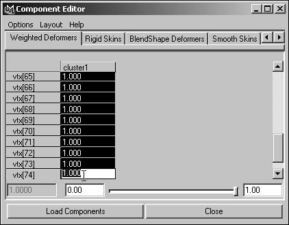 | Several of the deformers we've discussed have weights, which determine how much they affect any given point on a surface. In some cases, you may want to change the extent to which a deformer affects specific areas of an object. To do this, you can modify its weights in the Component Editor or paint their values using Maya's Paint Attributes tool. The Component Editor provides a numeric view of the weights and is most useful when you want to change the weights on a specific group of points to a specific value. The Paint Attributes tool displays the weights on your model, with pure white representing a weight of 1.0 and pure black representing a weight of 0. This tool lets you paint or flood specific values or smooth the transition between values. To edit deformer weights in the Component Editor: 1. | In component mode, select the points whose weights you want to modify (Figure 13.53).