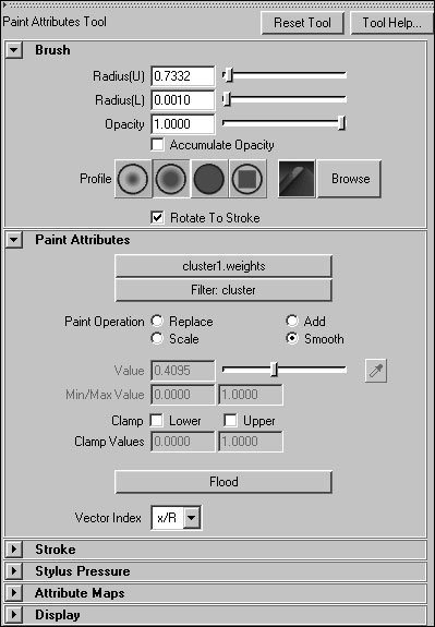 Figure 13.57. The Tool Settings window lets you choose a Paint Operation and Value to paint with, along with other settings.  | | | 4. | If it isn't already selected, choose Smooth Shade All from your view's Shading menu.