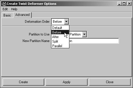 Figure 13.64. In the Advanced tab of a new deformation's Deformer Options window, you can change where in the Deformation Order the deformation is added.  | 4. | The newly created deformer is applied before any existing deformers on the object.
