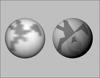| When you're working with shaders in Maya, you can see a rough real-time preview of your object's final appearance. To get a definitive look at what the object looks like, you have to render it (Figure 14.25). Rendering is discussed in Chapter 16. Figure 14.25. The real-time display is on the left, and the rendered version on the right. Note the difference in detail.  You'll make many changes as you work on your shader. Maya Interactive Photorealistic Renders (IPR) store information so that you can update your render in near real time. Your final rendered image updates as you tweak surface attributes. In some respects, IPR lets you work with a real-time render. Keep in mind that Maya creates a default light when you perform a render or IPR on your scene. Any scene needs at least one light to render. To perform an IPR render: 1. | Create a scene with a few objects in itfor example, a few primitives (Figure 14.26).