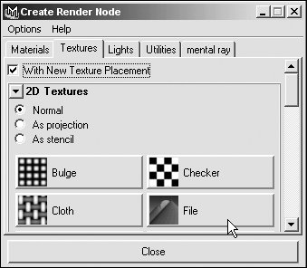 Figure 14.42. In the Create Render Node window, you can choose which new texture you want to map to an attribute of a material.  The Attribute Editor for the File node opens.
