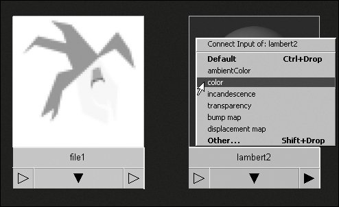 Figure 14.43. New nodes are created and placed in the workspace. The colored lines indicate connections from one node to another. | | | 8. | With the middle mouse button, drag the lambert you created from the Hypershade onto your surface.