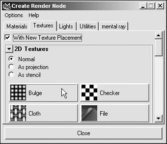 Figure 14.46. Clicking Bulge in the Create Render Node window creates a bulge texture that is mapped to the bump of a material.  The bulge shows up in the Work Area. You need to render it to see the resulting bump.