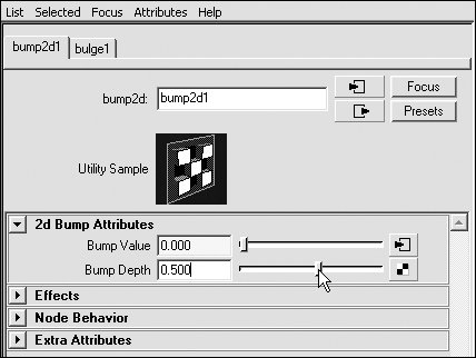 Figure 14.48. The Attribute Editor for the bump2d node contains the bump depth attribute. Bump depth controls the overall height of the bump.  The bulges grow or shrink accordingly (Figure 14.49).