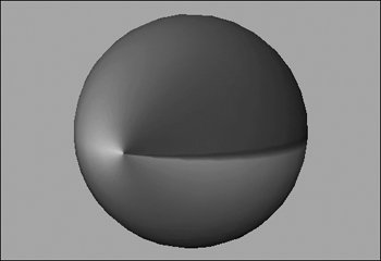 Figure 14.54. With only one repetition, the surface has just one bulge.  | Procedural textures The bulge texture you just used is an example of a procedural texture. Procedural textures are images that have their color and value determined mathematically. This means they're easier to place and have infinite resolution. Procedural textures are used to generate simple surfaces like rubber or concrete, add detail such as dirt or bumps to existing surfaces, make realistic metallic surfaces, and more. One commonly used procedural texture is a ramp, which is like a gradient. To assign a ramp texture to a surface: 1. | Choose Create > NURBS Primitives > Sphere.