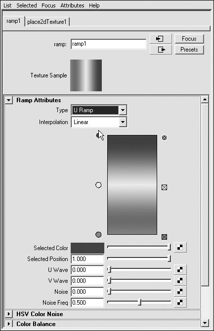 Figure 14.57. The Attribute Editor for the ramp holds the controls for determining the look of the gradient it produces. Position indicators are the circles to the left of the ramp. They determine where a color is positioned within the gradient.  | 5. | Change the position indicator's color to black by dragging the Selected Color slider all the way to the left.