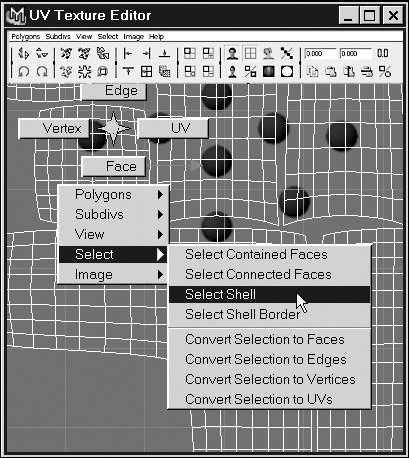 Figure 14.85. Rather than having to carefully select each UV of the shell, you can select the whole shell at once by right-clicking and choosing Select > Select Shell from the marking menu.  All the UVs of the shell are selected.