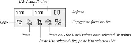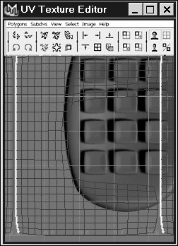 Figure 14.98. The phone now unfolds evenly, as one piece. | Tips Select Pin Selected in the Unfold option if you want to retain the layout of certain UVs. This prevents selected UVs from moving during the unfold operation. You can pin an object's corners or lines of symmetry to force the object to unfold a certain way. For example, aligning the center of a character's face and then pinning it, or pinning the corners of a flag in a square, forces the shape into a logical arrangement. Using the UV Texture Editor toolbar The UV Texture Editor toolbar holds shortcuts to many of the actions in the UV Texture Editor menus. The toolbar is divided into four main sections: UV Position buttons, Isolate Selection buttons, View buttons, and UV Edit buttons. They provide the following functions: UV Position buttons This section holds shortcuts to many of the UV position tools, including flipping, rotating, sewing, and aligning UVs (Figure 14.99). Figure 14.99. The UV Position buttons section of the UV Texture Editor toolbar. Isolate Selection buttons This section holds shortcuts to adding, removing, and toggling isolation tools (Figure 14.100). Figure 14.100. The Isolate Selection buttons section of the UV Texture Editor toolbar.  View buttons This section holds snaps, toggles, and border menu shortcuts (Figure 14.101). Figure 14.101. The View buttons section of the UV Texture Editor toolbar.  UV Edit buttons This section holds UV coordinate input fields as well as UV copying and pasting features (Figure 14.102). Figure 14.102. The UV Edit buttons section of the UV Texture Editor toolbar.  About projecting UV maps Earlier in this chapter, you were shown how to project a texture; you can also project UV maps. One main difference is that a projected UV map sticks to the object even if it deforms, whereas a deforming object will "swim" through a projected texture. To create a planar UV map for a polygon object: 1. | Open the model of the polygon telephone you made in the first step of the task "To create automatic mapping for a polygon texture" earlier in this chapter.