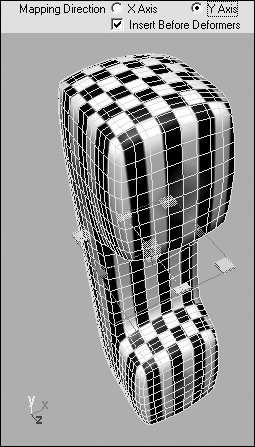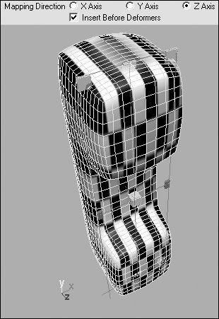 Figure 14.113. Deselect Insert Before Deformers to allow the mapping to be applied to the object in its current deformed shape.  | To create a cylindrical UV map for a polygon object: 1. | Repeat steps 1-5 from the previous task, "To create a planar UV map for a polygon object."