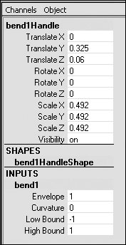 | | | 15. | In the Inputs section of the Channel Box, click bend1 to reveal the bend controls (Figure 14.111).